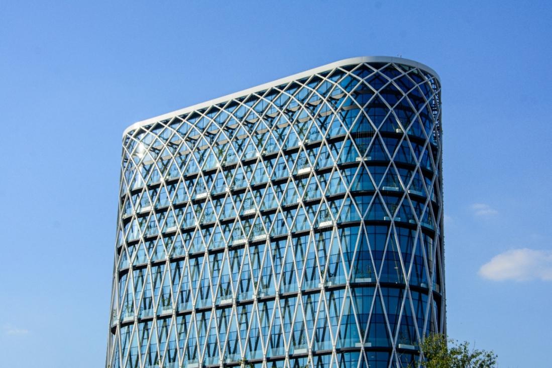 Зеленые насаждения – не единственная достопримечательность нового комплекса. 15-ти этажная высотка «затянута» ажурной диагонально-решетчатой оболочкой из металла, напоминая еще об одном московском шедевре архитектуры – знаменитой Шуховской башне.